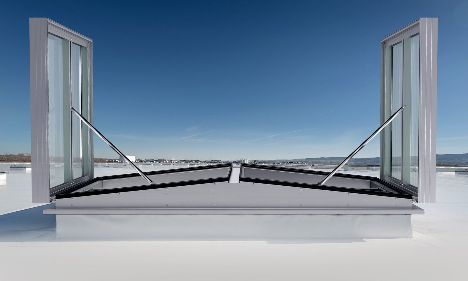 DELTA TG is a double flap smoke vent suitable for the removal of large quantities of warm air and / or smoke from a building within a short period of time, daily ventilation and natural lighting. Suitable for utilization on various kerbs and domes. The vents are manufactured according to ISO 9001 quality control standards and comply with the European requirements for NSHE according to EN 12101-2. Endurance tests with 10,000 opening and closing cycles have proven its robust and functional design. The vents are formed from high quality corrosion resistant aluminium to ensure low maintenance requirements and watertightness. Various methods of operation using pneumatic or electric actuators are available. Available on large dimensions, up to 2000 x 2000 mm (width x length).